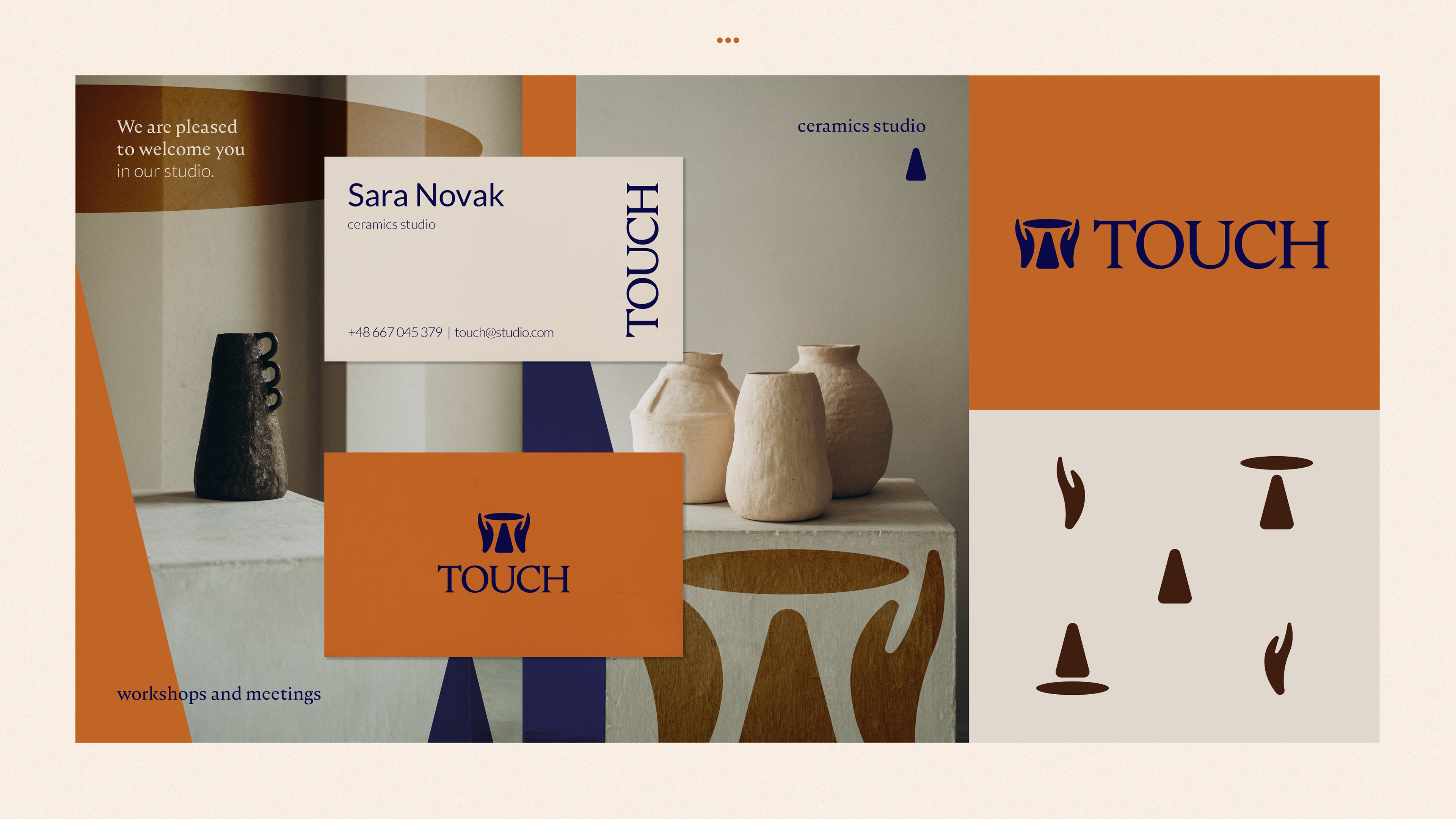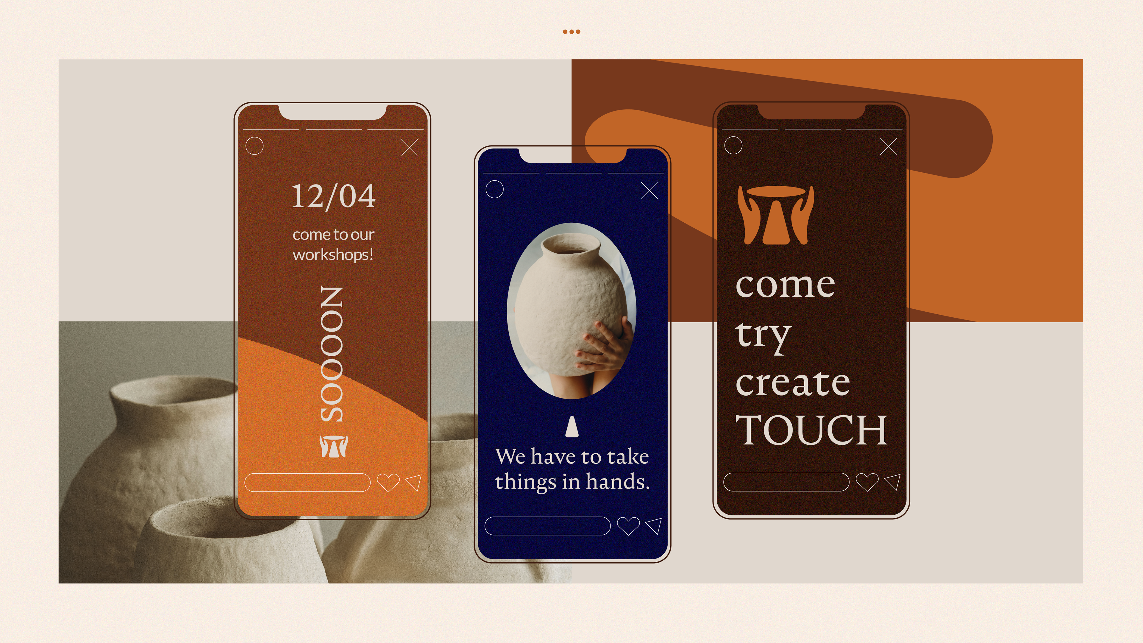 Visual identification for a ceramics studio. The sign is the basis for a set of icons illustrating the creative process of working with clay. The colors are inspired by vessels made of various clays and types of glaze.